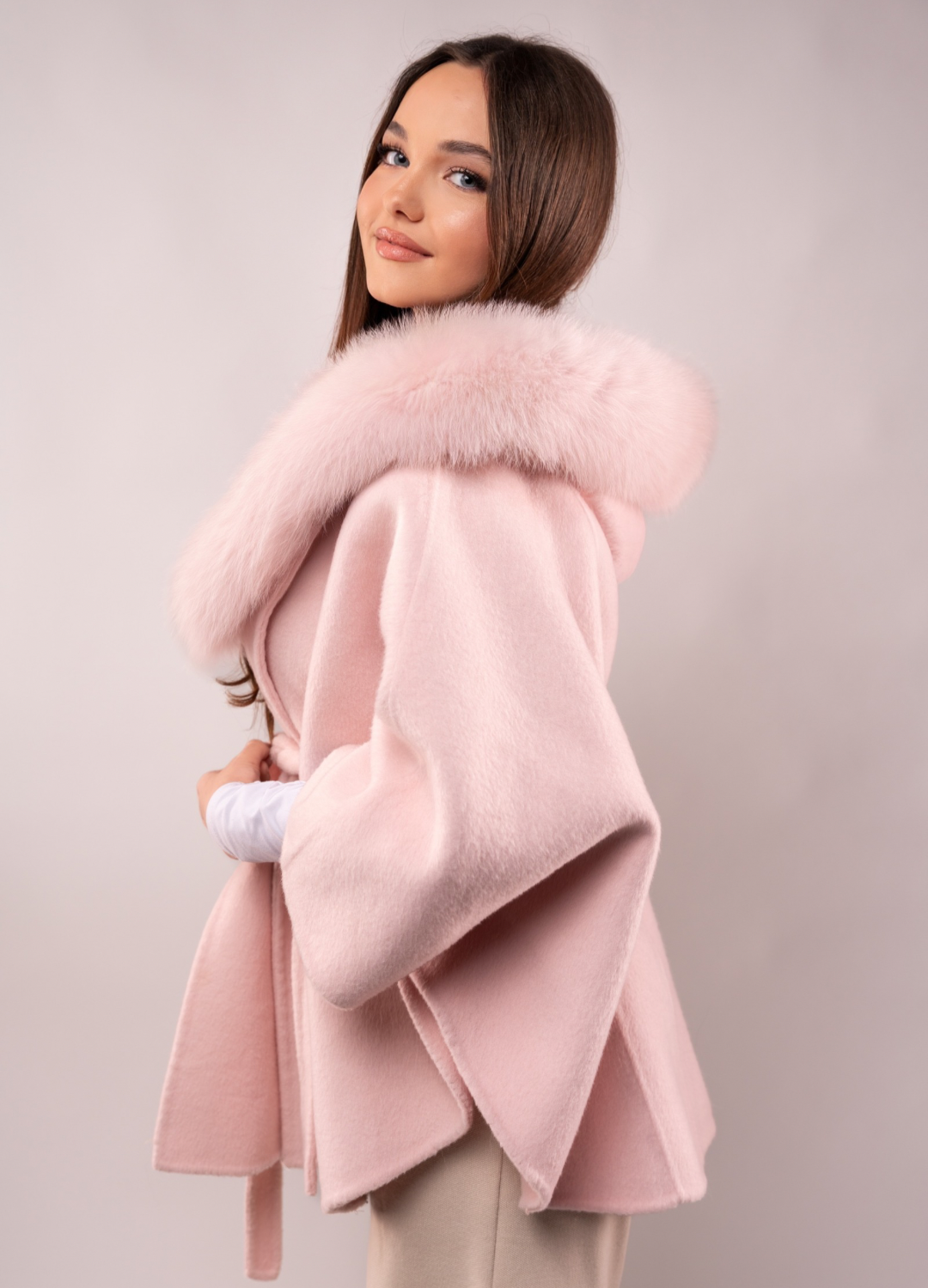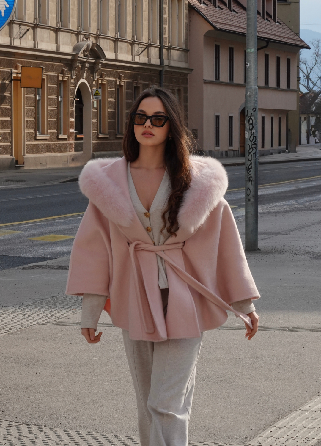 Oversize plašč s pasom, kapuco in pravim krznom – popolna kombinacija elegance in udobja